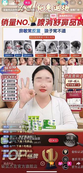 在新京报记者的多篇调查报道中,这种现象频繁出现。“腺腺、扁什么桃、鼻什么甲大了的,鼻鼻总是堵住塞住的,有敏敏痘痘炎炎、流鼻涕打喷嚏的都可以去用”,这是今年11月,记者在调查一款宣称可改善腺样体面容的舒鼻膏时,直播间一位主播就记者咨询的问题给出的答案。同前述液体口罩宣称类似,主播用“什么”来拆分正常词语以及叠词、变异词等变体表述,暗示腺样体肥大、扁桃体肿大、鼻甲肥大、过敏性鼻炎都可以使用该产品来改善。该直播间背景还多次出现“鼻敏常反复 孩子常不适”“花粉蒿粉、敏/窦/堵/塞”字样,将花粉过敏、鼻窦炎等症状进行删减,突出个别字眼。