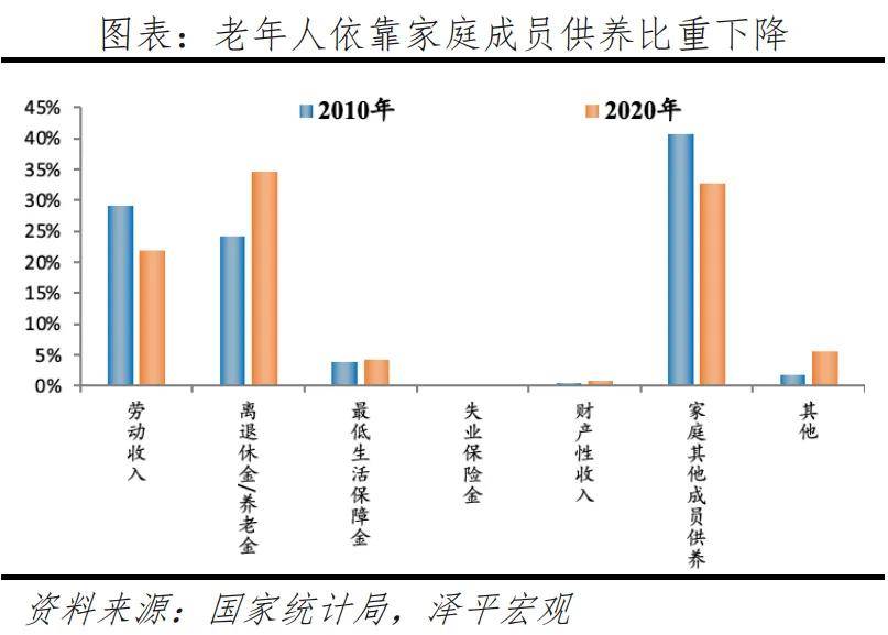 3)居住独立、经济独立,空巢老人占比超5成,2010-2020年依靠家庭供养比例从40.7%降至32.7%。随着传统观念转变,叠加家庭规模不断缩小、子女数量下降、人口流动加快,老年人更多选择不与成年子女同住。根据七普数据,全国有39.7%的老年人与子女同住,55.7%的老年人只与配偶同住或者独居。分城乡看,城市、镇、乡村独居老人占比分别为52.2%、53%、59.4%,由于农村大量年轻劳动力外出务工或定居更发达地区,更多老年人独居在家。此外,随着社会保障体系逐渐完善,更多老年人依靠离退休金生活,经济条件更加独立。根据人口普查数据,2010-2020年,60岁及以上人口中,依靠离退休金/养老金的占比从24.1%增至34.7%,依靠家庭其他成员供养的占比从40.7%降至32.7%。